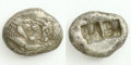 このコインでは、大きく口を開けたライオンと、雄牛が向き合う有名なデザインが打ち出されています。裏面の四角陰刻は、表面のモティーフを打ち出す際に、銀の塊を固定していた跡と見られています。しかしこの二つに分けられた刻印については、貨幣自体の価値を示しているのではないかという説もあります。