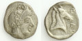 コインの表面には兜を被ったアテナ女神、裏面には馬の頭部が表現されています。馬の右側には、発行都市ファルサロスを示す銘「ΦΑΡ」が刻まれています。