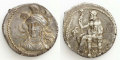 表面には知恵と戦術の女神アテナの正面像が打ち出されています。女神の兜からは長髪が出、風に靡いている様子が表現されています。微笑む女神が身につけている、耳飾りや首飾りなども細かく打ち出されており、大変状態が良いことが見てとれます。正面像のアテナ女神を表現したコインの例は少なく、また正面であるが故に磨耗に弱いという特性があります。このコインでは女神の鼻、目、唇も残されており、鑑賞に充分堪えうる美しさです。