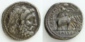 表面には月桂冠を戴く大神ゼウスの横顔肖像が打ち出されています。マケドニアのアンフィポリスで発行されたテトラドラクマ銀貨のゼウス神と類似しています。