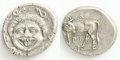 TOPアンティークコイン 古代ギリシャ SoldOut ゴルゴン/振り返る牡牛 価格: ¥0 (税込) 販売期間: 数量: 個 在庫: × 在庫 × 商品番号:226391 発行国:古代ギリシャ 地方名:ミュシア 都 市:パリオン 発行年:BC350-BC300 額 面:ヘミドラクマ 金 性:AR (Silver) 表図柄:ゴルゴン 裏図柄:振り返る牡牛 サイズ:13mm 重 量:2.43g 資 料:Sear3919 状 態:VF+ 舌を出して威嚇するゴルゴン(メデューサ)の周囲には蛇でできた髪の毛が配されている。見るものを石化する怪物ゴルゴンの姿は魔除けとされ、コインや鎧などに多く表現されていた。