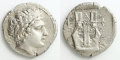 都市オリュントスを盟主とするカルキディア同盟下の発行。アポロ神の美しい横顔と、竪琴の描写がリアルな一枚。