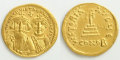 表面には皇帝ヘラクレイオス1世(在位:610年~641年)と息子ヘラクレイオス・コンスタンティノス(後のコンスタンティノス3世)が並ぶ肖像が打ち出されています。このタイプの肖像は発行年代が下がるにつれて、ヘラクレイオス1世の頬髯が伸び、コンスタンティノスが成長してゆくという、興味深い変遷を見せています。皇帝親子は十字架が据えられた宝冠と法衣を身に纏い、さらに頭上には小さな十字架が配されています。明瞭に残された図案の細部から、ビザンチンの金細工、芸術、技術力の高さを窺い知れます。まさに中世の宝物と言っても差し支えないでしょう。