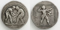小アジア南部、パンフィリア地方の都市アスペンドスで発行されたスターテル銀貨。古代オリンピックの競技を思わせるデザインのコイン。レスリングは青少年の心身を鍛える競技として、古代ギリシャの各都市で盛んに行われていました。多くの都市の代表が参加する大会で優勝すれば、英雄として賛美され、歴史にその名を残すことができるほどの栄誉が与えられました。