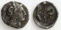 表面には知恵と戦術を司る女神 アテナの横顔像が打ち出されています。目鼻立ちや長髪、耳飾りまで確認でき、兜の装飾であるスキュラ(*海の怪物)までしっかりと表現されています。