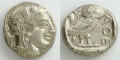 表面には、アテネの守護女神 アテナの横顔像が打ち出されています。目はアーモンド形であり、慎ましやかに微笑む女神像は古典期の様式がそのまま反映されています。頭部にはオリーヴ紋様が施されたアッティカ式兜を被り、大きな耳飾りと首飾りを身につけています。また、額の付近には極小の三日月が配されています。