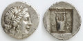 表面には光明神アポロの横顔像、裏面には詩歌・音楽の守護神アポロを象徴する竪琴が表現されています。左右には発行都市マシキュテスを示す「M A」銘、右下にはアポロ神の神託を象徴する小さな三脚鼎が配されています。