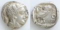 表面には、アテネの守護女神 アテナの横顔像が打ち出されています。目はアーモンド形であり、慎ましやかに微笑む女神像は古典期の様式がそのまま反映されています。頭部にはオリーヴ紋様が施されたアッティカ式兜を被り、大きな耳飾りと首飾りを身につけています。兜の装飾羽がほぼ全て出ている、貴重な状態です。