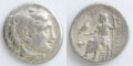 表面にはライオンの毛皮を被り、神話上の英雄ヘラクレスに重ねられたアレキサンダー大王(アレクサンドロス3世, 在位:BC336-BC323)の横顔肖像が打ち出されています。