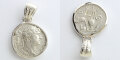 1900年前の古代ローマ帝国で造られた本物のデナリウス銀貨をペンダントトップにしました。コインの縁部分にはシルバー製のペンダント枠を丁寧に手巻きし、シンプルながらも繊細な一品に仕上げました。ローマコインの風合いと形状を損ねず、際立たせる形でペンダントにしています。
