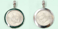 ユーロ以前のオーストリアで発行された5シリングコインを、肉厚のシルバー枠でペンダントにしました。周囲の枠にはグリーンのエナメルを施し、重厚な色合いを演出しています。表面の騎馬像はハプスブルク朝時代から続くウィーンの馬術教練場「スペイン馬術学校」の一場面を表現しています。