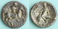 カラブリア地方タレントゥムで発行されたノモス銀貨。タレントゥムの名の由来は海神ポセイドンの息子、タラスに因むもので、タラスは父が遣わしたイルカに乗って難破船から助かり、辿り着いた海岸にタレントゥムの町が建てられたという伝説による。現在でもタラントとして南イタリア最大の軍港である。タレントゥムの市民は馬術に秀でていたので、馬と騎士の図柄はこの都市の代表的モチーフとなっている。