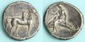 カラブリア地方タレントゥムで発行されたノモス銀貨。タレントゥムの名の由来は海神ポセイドンの息子、タラスに因むもので、タラスは父が遣わしたイルカに乗って難破船から助かり、辿り着いた海岸にタレントゥムの町が建てられたという伝説による。現在でもタラントとして南イタリア最大の軍港である。タレントゥムの市民は馬術に秀でていたので、馬と騎士の図柄はこの都市の代表的モチーフとなっている。