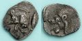 古代ギリシャ、ミュシア地方のキジコスで発行・使用されたオボル貨。毛並みまで表現されたイノシシとライオンが細かく表現され、当時の人々の自然観が窺えます。