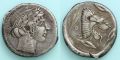 表面には月桂冠を戴くアポロ神(アポロン)の横顔像が打ち出されています。月桂樹はアポロ神の聖樹とされ、様々なコインに表現されたアポロ神はほぼ月桂冠を戴いています。