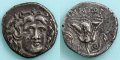 ヘレニズム時代、ロードス島はプトレマイオス朝エジプトなどの庇護を受けながら、エーゲ海貿易の拠点として大いに繁栄しました。ヘリオス神とバラを表現したロードス島のコインは各地で受け入れられ、ヘリオス神の美しい正面像から人気があります。