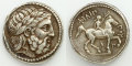 このテトラドラクマ銀貨は、古代ギリシャコインの代表格の一つとして知られます。表面には、ギリシャ神話の大神ゼウスの肖像が打ち出されています。豊かな頬髯と月桂冠が特徴的なゼウス神の肖像は、神々の王に相応しい威厳に満ちています。このゼウス神の肖像は、マケドニア王国飛躍の礎を築いた王 フィリッポス2世(在位:BC359年~BC336年)の肖像に重ね合せて造られたと云われます。