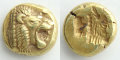 エーゲ海のレスボス島で造られた極小のヘクテ貨は、「エレクトラム」と呼ばれる金と銀の自然合金によって造られています。