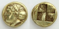 こうしたエレクトラム製のヘクテ貨は、イオニアのフォカイアとレスボス島のミティリーニ(ミュティレネ)で盛んに造られ、多種多様なデザインが存在します。フォカイアで発行されたヘクテ貨の裏面には、共通して卍型の四分割刻印が打たれています。