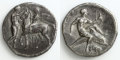 イタリア半島の植民都市タレントゥム(現在のターラント)で造られたノモス銀貨。ノモスはドラクマ銀貨2枚分の価値があったと推定される。