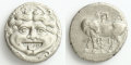 舌を出して威嚇するゴルゴン(メデューサ)の周囲には蛇でできた髪の毛が配されている。見るものを石化する怪物ゴルゴンの姿は魔除けとされ、コインや鎧などに多く表現されていた。