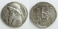 ミトラダテス2世(在位:BC124年~BC88年)の横顔肖像が打ち出されています。頭部にはダイアデム(帯)を巻き、耳には輪状の飾りをつけています。ミトラダテス2世はパルティア最盛期の君主であり、アルメニアやセレウコス朝シリア、ローマと戦い領土を拡大させたことから「大王」の尊称号で呼ばれています。