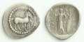 テッサリア平原はギリシャ北部に位置し、丘陵地の多いギリシャ諸都市とは異なる地理環境にありました。テッサリアではその地理的特性を利用して馬を多く飼育し、ギリシャ諸都市に軍馬を輸出・供給することで繁栄しました。当時テッサリアで発行されたコインにも、写実的な馬の姿が多く表現されています。