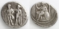 紀元前4世紀の小アジア南部、キリキア地方の古代都市マロス(現:トルコ南東部,ピュラモス川河口付近)で発行されたスターテル銀貨。当時のキリキアはアケメネス朝の影響下に置かれ、ギリシャ文化とペルシア文化が融合したデザインのコインが数多く発行された。