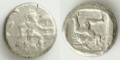 走る兵士の姿は古代オリンピックにおける徒競走者、またはトロイ戦争に登場する俊足の戦士アイアースを表現したものとされる。裏面の三脚巴(トリスケル)は発行都市アスペンドスの象徴である。