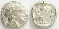 紀元前5世紀後半、アッティカ地方の古代都市国家 アテネ(アテナイ)で発行されたテトラドラクマ銀貨。4ドラクマに相当したこの銀貨は、アテネの繁栄を象徴するコインとして広く知られています。主に交易での決済通貨として広く用いられ、エーゲ海域だけでなく小アジアやフェニキア、エジプト、遠くアラビア半島の南部にまで流通しました。