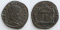ミルウィウス橋の戦い コインにはマクセンティウス帝の肖像と共に、ローマ女神を奉る神殿が表現されている。神殿内に安置された女神の坐像は槍を携え、右手で球(=世界=ローマ帝国の象徴)を持っている。マクセンティウスの在位中にローマで発行されたコインには、ローマ神殿や双子神ディオスクロイ、雌狼とロムルス、レムスなど古来のローマの神々が頻繁に表現された。マクセンティウス帝がキリスト教ではなく、伝統的な多神教に重点を置いていたことがうかがえる。