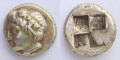 金と銀の合金エレクトラム(electrum,琥珀金)によって造られたヘクテ貨は、1/6スターテルの価値に相当する小さなコインです。当時、エレクトラムのコインを発行していた都市は限られていました。レスボス島のミュティレネでも同様のコインが多く発行されていることから、両都市の経済的結びつきが覗えます。