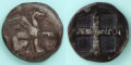 裏面には四分割された四角陰刻があり、十字部分の上には発行都市テオスを示す「ΑΓNΩN」と「THIΩN」の銘が交差して刻まれています。陰刻部分の内部には、非常に細かいドット群がみられます。