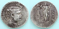 ヘレニズム時代に栄えたギリシャ系王朝の一つ、グレコ=バクトリア王国で発行されたテトラドラクマ銀貨。表面には王の肖像、裏面にはギリシャ神話の神が表現された、典型的なヘレニズムスタイルのコインです。